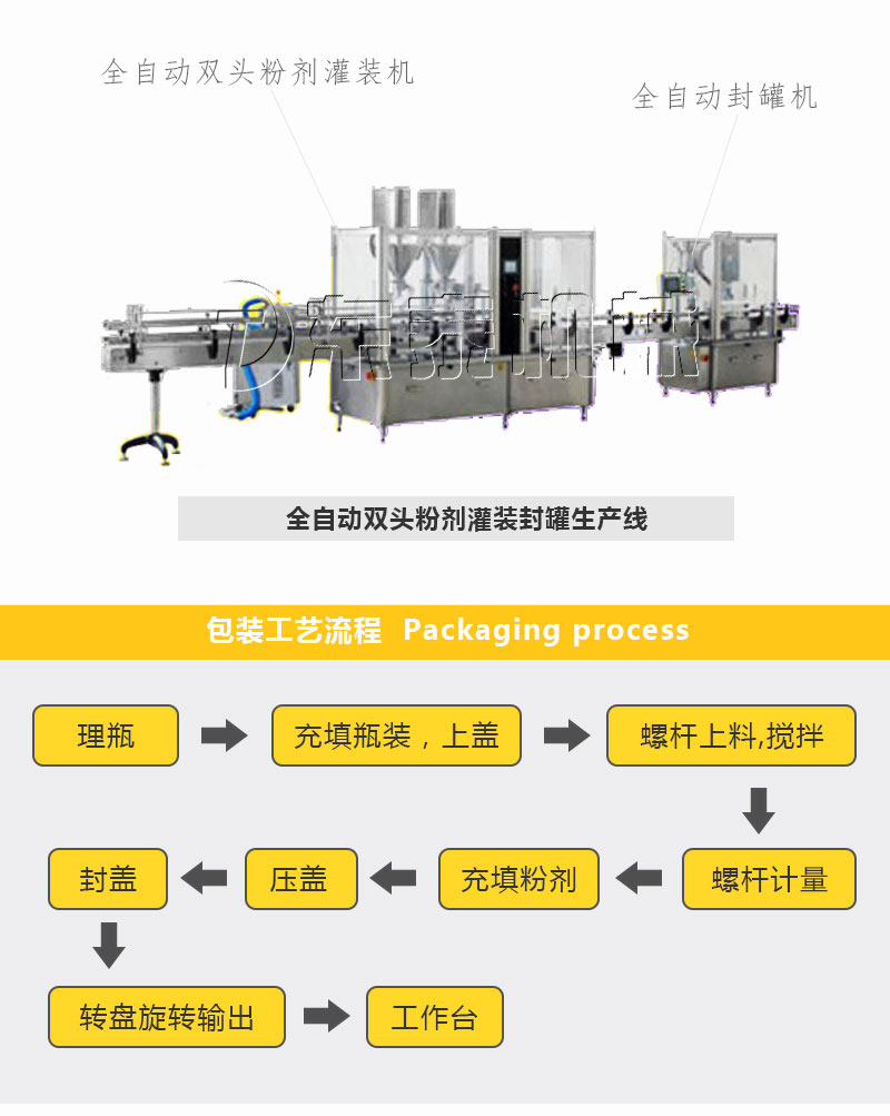 全自動(dòng)粉劑灌裝機(jī)是我公司的主打產(chǎn)品,根據(jù)客戶的要求公司開發(fā)出了單頭、雙頭、四頭、六頭瓶裝生產(chǎn)線,全自動(dòng)奶粉灌裝機(jī)專門針對藥品、保健品、食品行業(yè)的粉劑瓶裝。結(jié)合不同的客戶需求可配套:上料(螺桿、真空)、自動(dòng)理瓶,單(雙)頭加塞、旋蓋、軋蓋、壓蓋等,鋁箔封口(風(fēng)冷、水冷),金檢,鋁箔塞墊,貼標(biāo),碼瓶熱收縮,裝盒,三維包裝(帶金線),裝箱等。