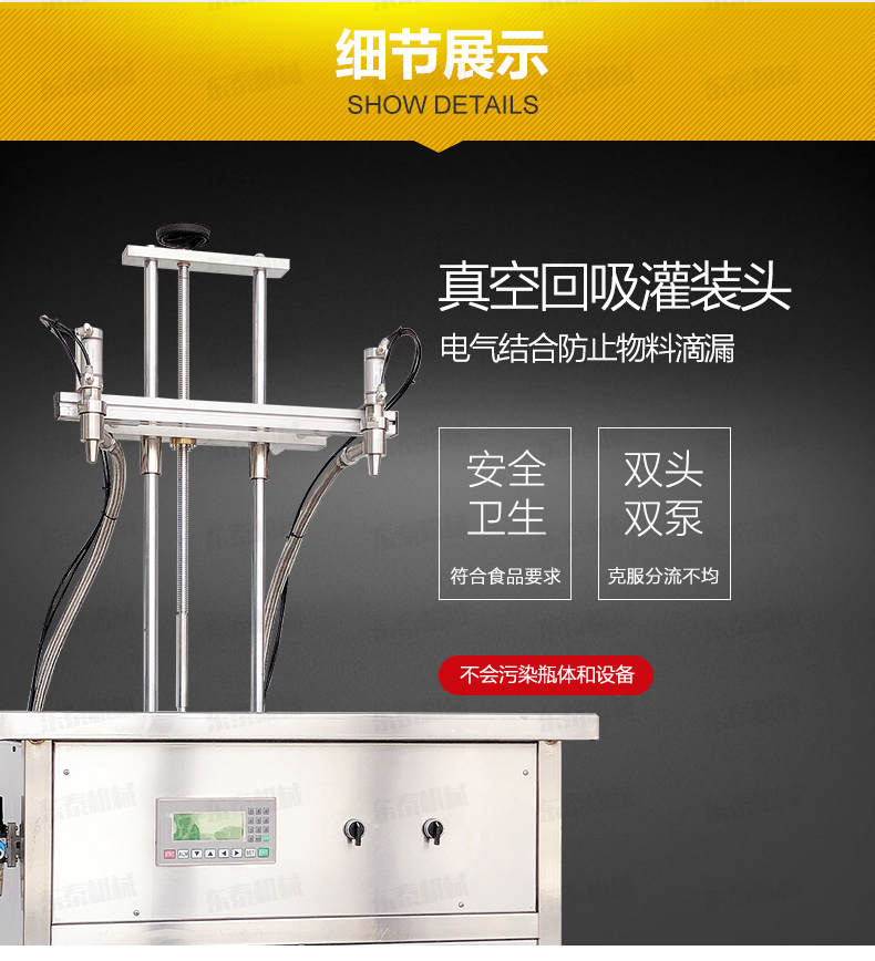 5.電氣結(jié)合---灌裝頭帶有回吸功能,防止物料滴漏,保證了瓶身與設(shè)備的潔凈