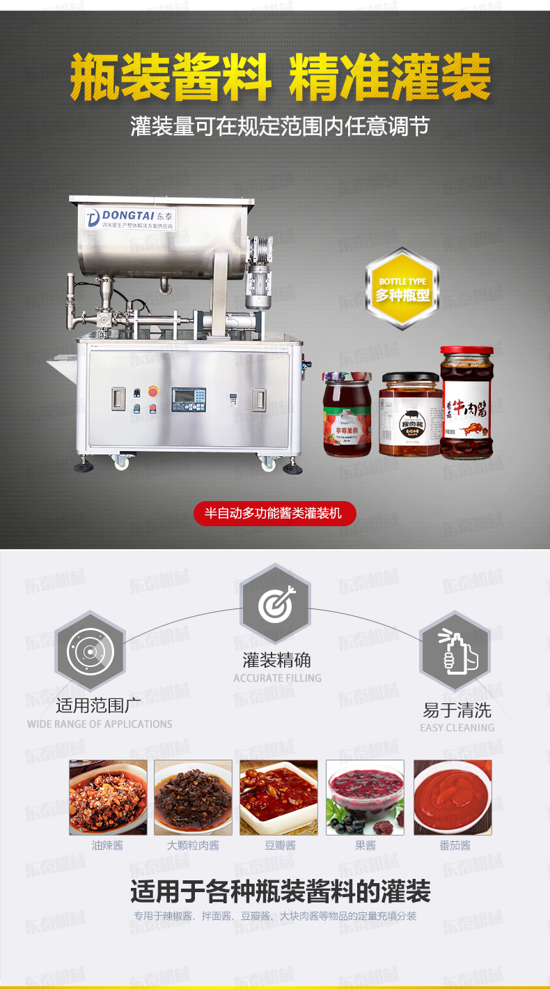 雙頭辣椒醬定量灌裝機設(shè)備適用范圍:本瓶裝辣椒醬灌裝機專用于辣椒醬、拌面醬、豆瓣醬、大塊肉醬等物品的定量充填分裝,適合于將各類粘稠體及含有各種固體物質(zhì)如辣椒、花生、肉塊、佐料等物體的醬類灌裝各種容器中,適用于各種瓶裝醬料的灌裝。