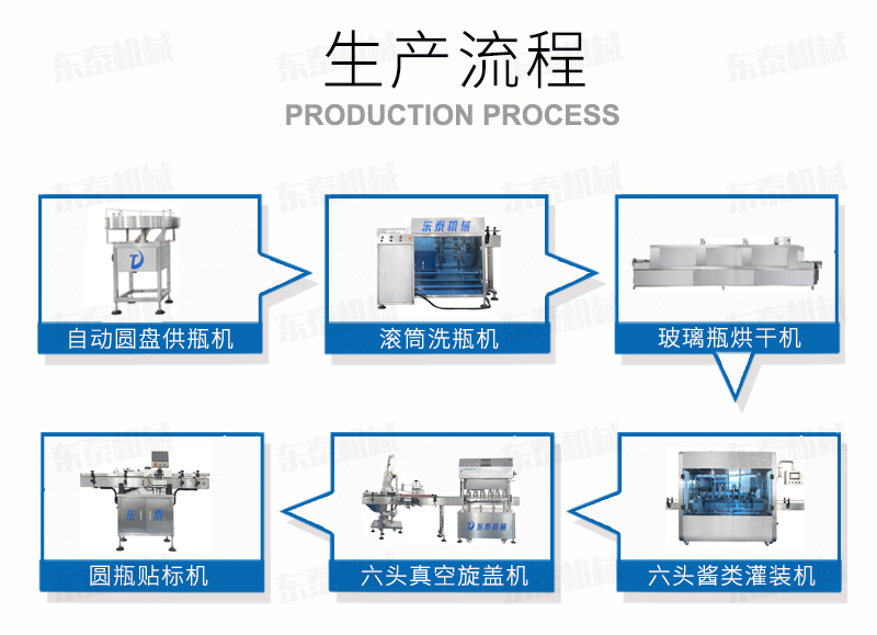 醬料灌裝生產線成套設備組成: 自動供瓶機+全自動滾筒洗瓶機+自動六米烘干機+自動收瓶機+全自動六頭灌裝機自動灌裝+全自動提蓋機自動理蓋、提蓋、掛蓋+六頭真空旋蓋機同時六個頭真空旋蓋+套標機+收縮機+
