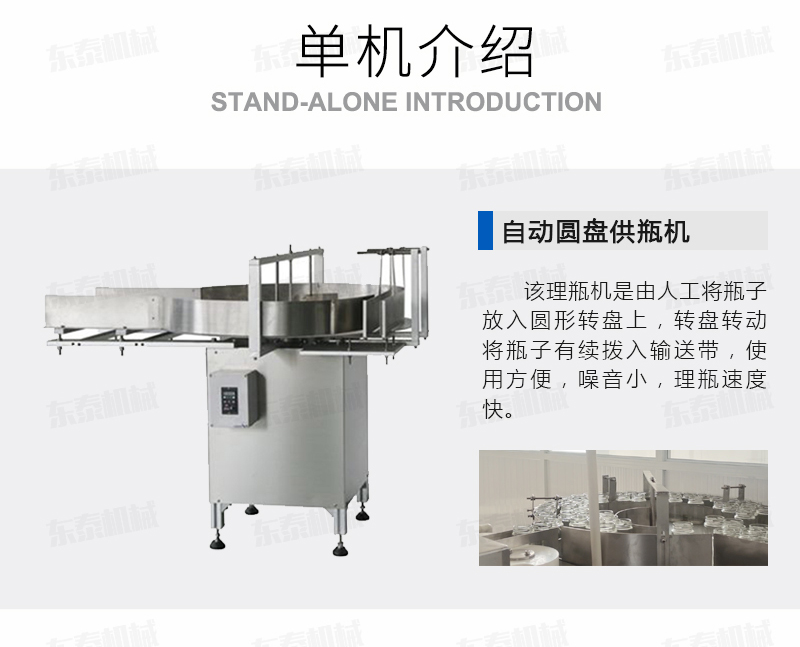 該理瓶機是由人工將瓶子放入圓形轉盤上,轉盤轉動將瓶子有續(xù)撥入輸送帶,進入灌裝機進行灌裝。使用方便,噪音小,理瓶速度快,操作簡單是不可缺少的一個環(huán)節(jié)。