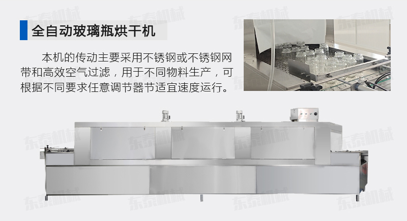 本機適用玻璃瓶及其它玻璃容器的干燥滅菌,食品等行業(yè)烘烤之用。 本機的傳動主要采用不銹鋼或不銹鋼網帶和空氣過濾,用于不同物料生產,可根據不同要求任意調節(jié)器節(jié)適宜速度運行。本機電熱元件選項用乳白色石英玻璃管為加熱元件,具有系數高、能耗低、升溫區(qū)、降溫區(qū)、冷卻區(qū)等區(qū)域,溫度范圍有50-300℃本機除機架外,全部采用不銹鋼材料制作,保溫材料采用硅酸鋁纖維,保溫性能好等優(yōu)點,是制藥-食品-日化等行業(yè)的選擇。