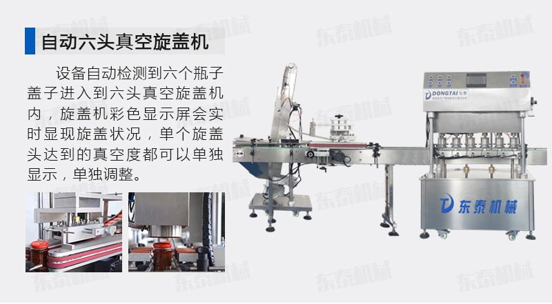該直線式真空旋蓋機是東泰機械結合用戶使用的情況,摒棄了傳統(tǒng)轉盤式真空旋蓋機的弊端,研制開發(fā)的設備,設備自動檢測到六個瓶子蓋子進入到六頭真空旋蓋機內,旋蓋機彩色顯示屏會實時顯現旋蓋狀況,整機多點檢測,當進口無瓶無蓋、出口堵塞、定位不準、瓶身傾倒均自動停機。單個旋蓋頭達到的真空度都可以單獨顯示,單獨調整!