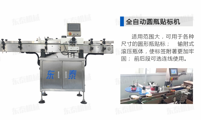 全機采用的技術:微電腦-PLC-電子光纖傳感器控制系統(tǒng),使整機運行穩(wěn)定、高速; 操作系統(tǒng)采用操作界面控制,操作簡便、實用、效率高,并有產量記數功能; 技術的速度快且穩(wěn)定; 適用范圍大,可用于各種尺寸的圓形瓶貼標; 輸附式滾壓瓶體,使標簽附著更加牢固; 前后段可選連線使用。
