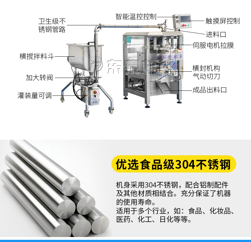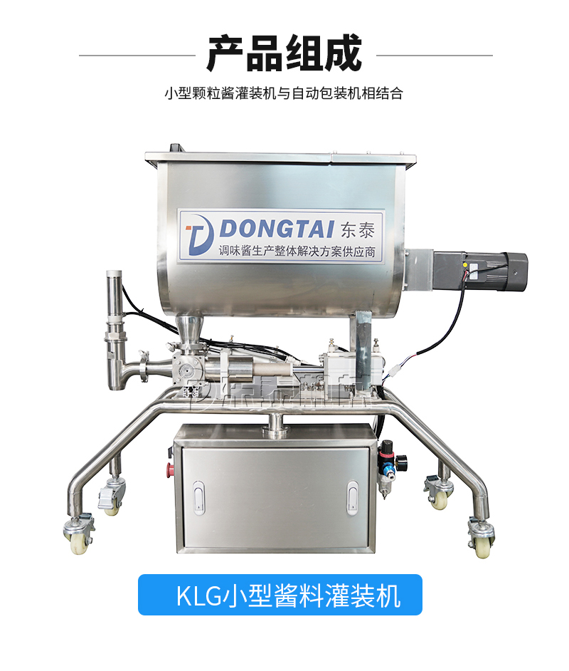 本機器主要用于調(diào)味品醬料的自動化包裝,機器安裝有橫向螺帶式攪拌,使油醬混合均勻,確保灌裝精度和產(chǎn)品包裝成品的均勻性。灌裝計量設(shè)備安裝有萬向輪,管路鏈接均采用快拆接頭,方便灌裝機拆卸移動清洗。包裝設(shè)備采