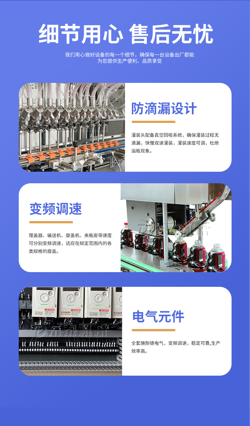 電子量杯感應(yīng)直列式灌裝機(jī),是目前國內(nèi)液體灌裝的高端產(chǎn)品,自動(dòng)化程度高,灌裝計(jì)量精確,適用于塑料瓶、玻璃瓶等各種幾何形狀的瓶型的不含氣體的酒水、飲料、調(diào)味品及其他溶液的定量灌裝。機(jī)器采用觸摸屏代替?zhèn)鹘y(tǒng)的按鈕操作,操作簡單、方便、直觀?萍己扛摺C(jī)器灌裝計(jì)量可通過觸摸屏對(duì)灌裝時(shí)間的調(diào)整實(shí)現(xiàn)不同計(jì)量灌裝,方便操作者使用。