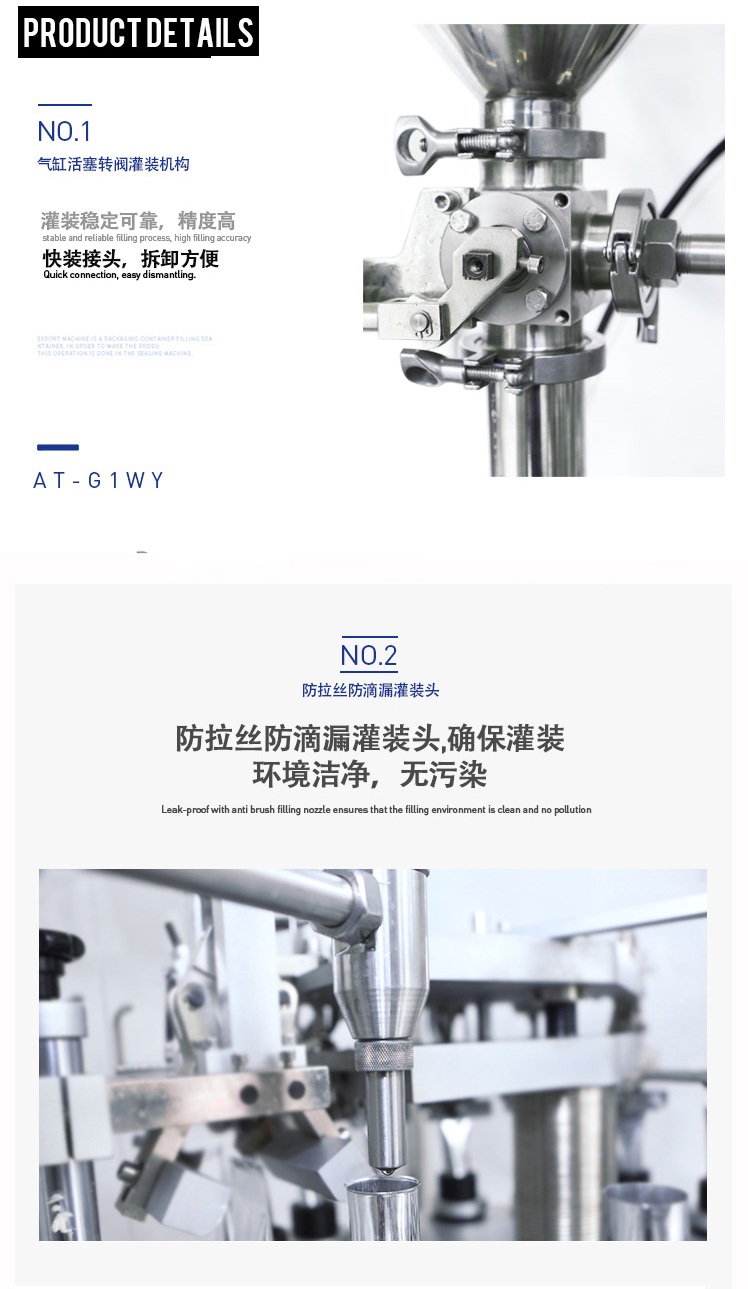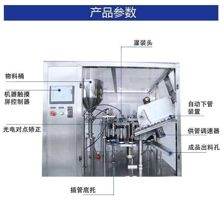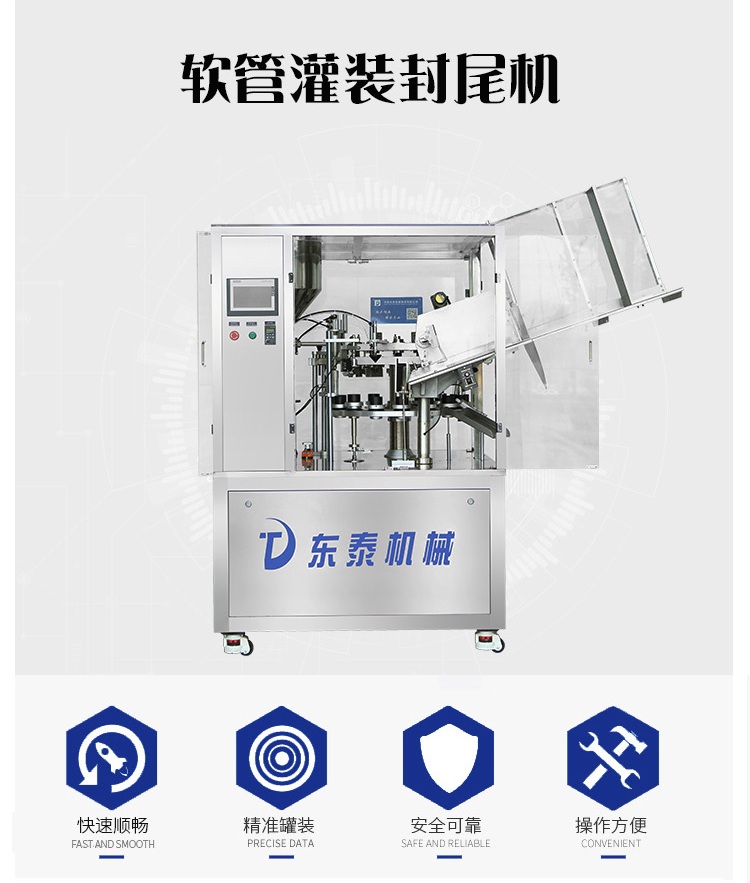 適用于醫(yī)藥、食品、化妝品、日用化工用品等行業(yè)的塑管、鋁塑復合管灌裝封尾需要?蓪⒏鞣N糊狀、膏狀、粘度流體等物料順利準確地注入軟管中,并完成管內熱風加熱、封尾和打批號、生產日期等。
