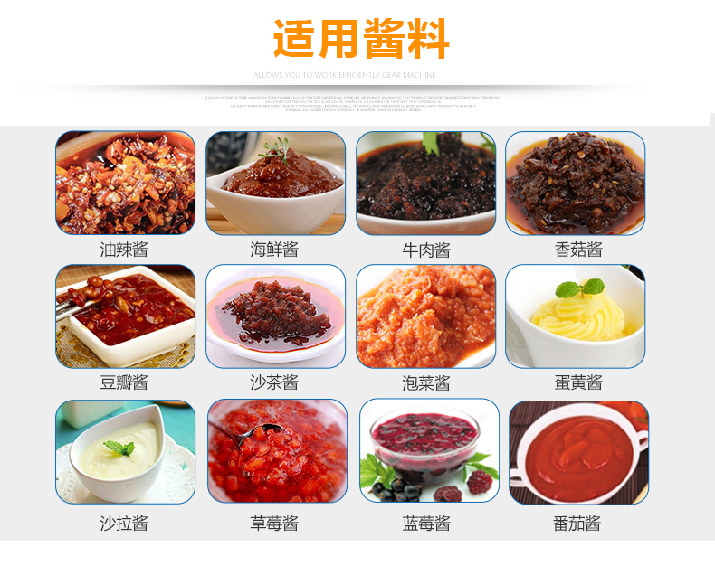 灌裝機(jī)采用活塞式灌裝原理,適用于調(diào)味品中帶顆粒并且濃度較大的辣椒醬、豆瓣醬、花生醬、香菇醬、果醬、牛油火鍋底料、紅油火鍋底料、蝦醬等較為粘稠醬類的灌裝。
