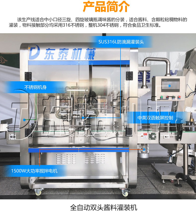 該機(jī)為全自動(dòng)醬類灌裝機(jī),配有自動(dòng)攪拌功能,使物料混合更加均勻 ,有效的解決灌裝誤差大的問(wèn)題;本機(jī)輔料添加料可調(diào),精準(zhǔn)方便,提高自動(dòng)化程度。 醬類灌裝機(jī)氣動(dòng)部分均采用氣動(dòng)元件,壽命長(zhǎng),穩(wěn)定。 物料接觸部分采用SUS316L不銹鋼材料制成,符合食品醫(yī)藥安全衛(wèi)生要求。 灌裝閥由氣動(dòng)閥控制,灌裝精度更高。 灌裝量和灌裝速度均可任意調(diào)節(jié)。 灌裝頭是我公司創(chuàng)新的灌嘴,可有效解決拉絲、滴漏問(wèn)題. 該醬類灌裝機(jī)大小瓶調(diào)節(jié)方便,配置自動(dòng)升降裝置。 采用集成理念設(shè)計(jì),易損件少,方便企業(yè)維護(hù)保養(yǎng)。 該全自動(dòng)醬類灌裝機(jī)設(shè)有無(wú)瓶不灌裝功能,不需更換零件,即可快速調(diào)整各種不同形狀規(guī)格的瓶子。